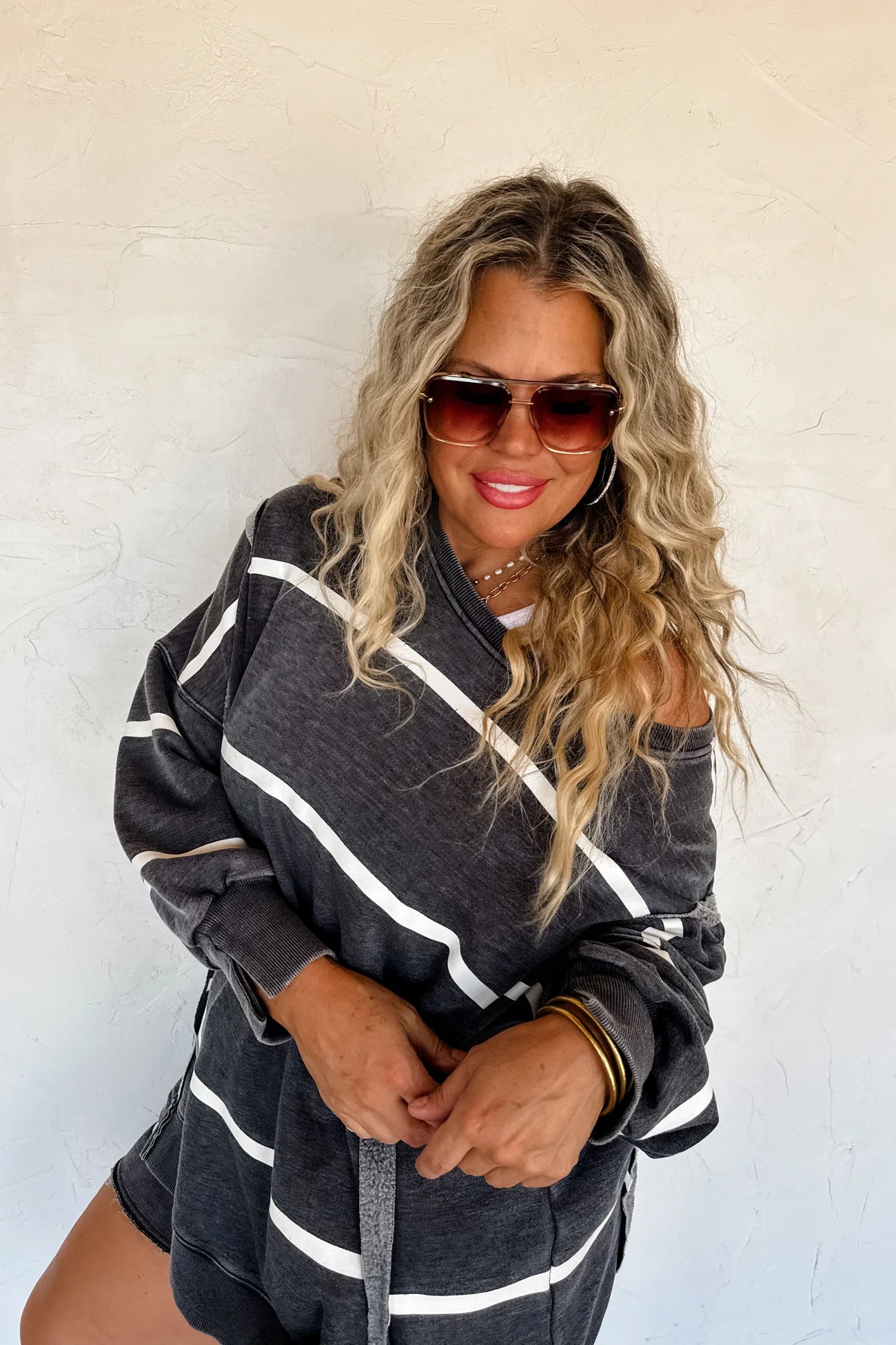 Features: Dropped shoulders, scoop neckline, exposed seaming, split cuff detail