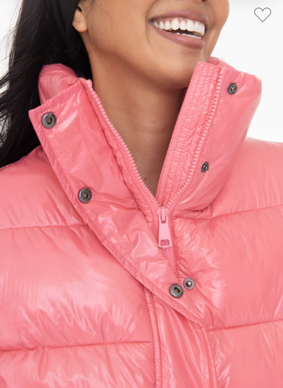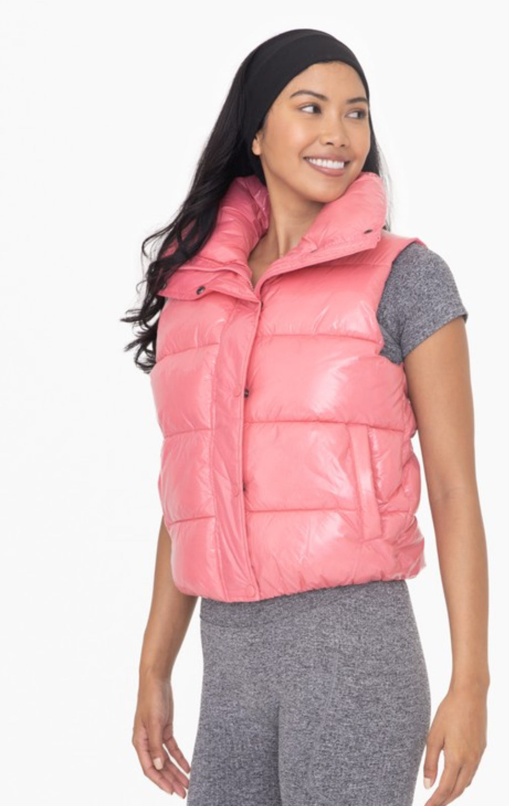 Elevate your fashion sense with our glossy faux patent leather vest, featuring a sleek high-shine finish and practical design elements. The classic fit, high neck, and full snap placket conceal a center front zipper, while poly fill provides warmth. With elegant welt pockets and a fusion of style and function, this vest is a must-have. Model Ericka, who stands at 5'8" and wears a size 4, looks stunning in an S. Made of 100% polyester.